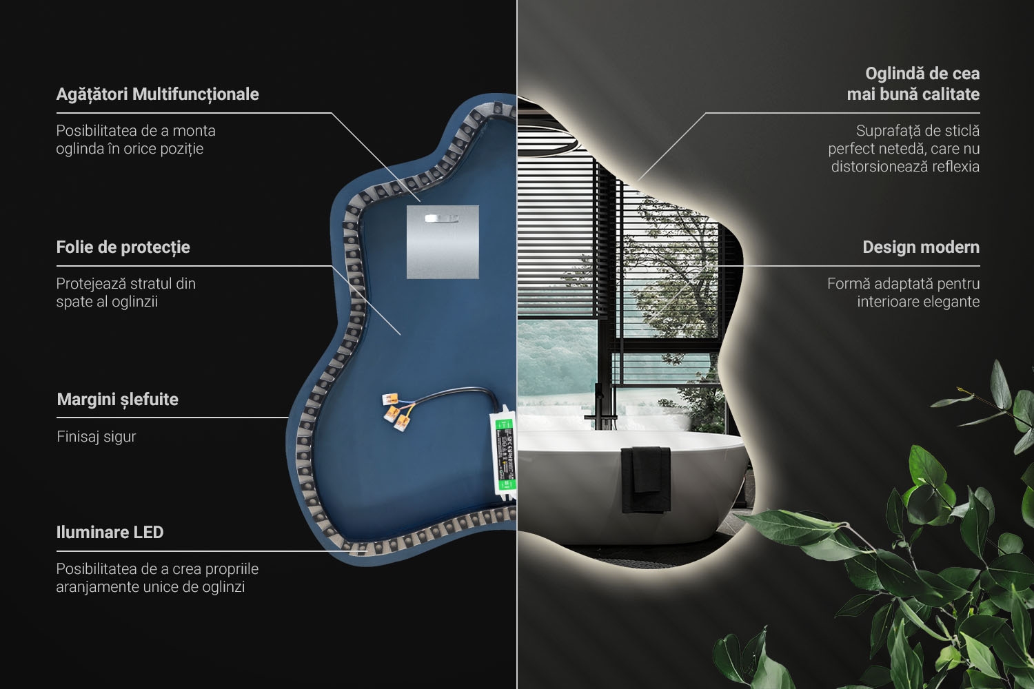 Disponibilă în mai multe dimensiuni, se potrivește perfect în living, dormitor, baie sau hol. Designul fără ramă îi oferă un aspect modern și aerisit, iar sistemul de montaj, cu agățătoare metalice solide și distanțiere din spumă, asigură o instalare simplă și sigură. Această oglindă neregulată cu iluminare LED reprezintă combinația ideală între funcționalitate și efect decorativ – evidențiază stilul tău și transformă orice încăpere într-un spațiu cu caracter inconfundabil.
