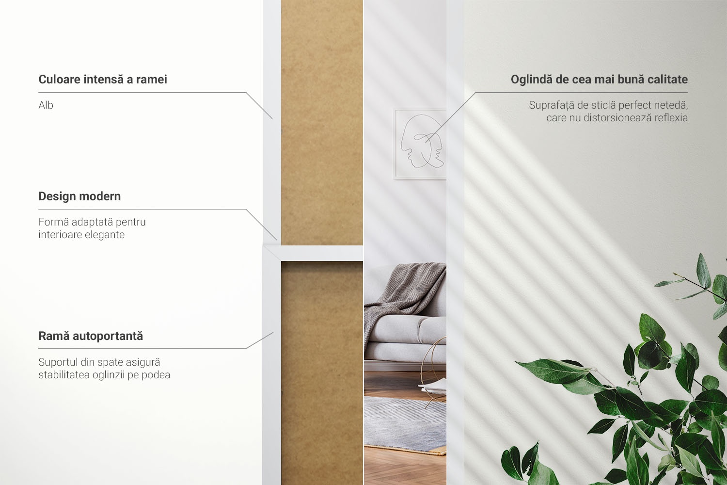 Gândită pentru confortul tău, oglinda mare cu suport este prevăzută cu suport, astfel încât o poți așeza oriunde dorești, fără montaj complicat. Este alegerea ideală pentru dressing, unde îți oferă o vedere completă și elegantă, dar se potrivește la fel de bine în dormitor, hol sau living. Adaugă personalitate, stil și un plus de rafinament spațiului tău, în timp ce te bucuri de un obiect decorativ practic și versatil. Alege această oglindă în ramă albă și oferă camerei tale acel detaliu care face diferența – unul care te va cuceri zi de zi.