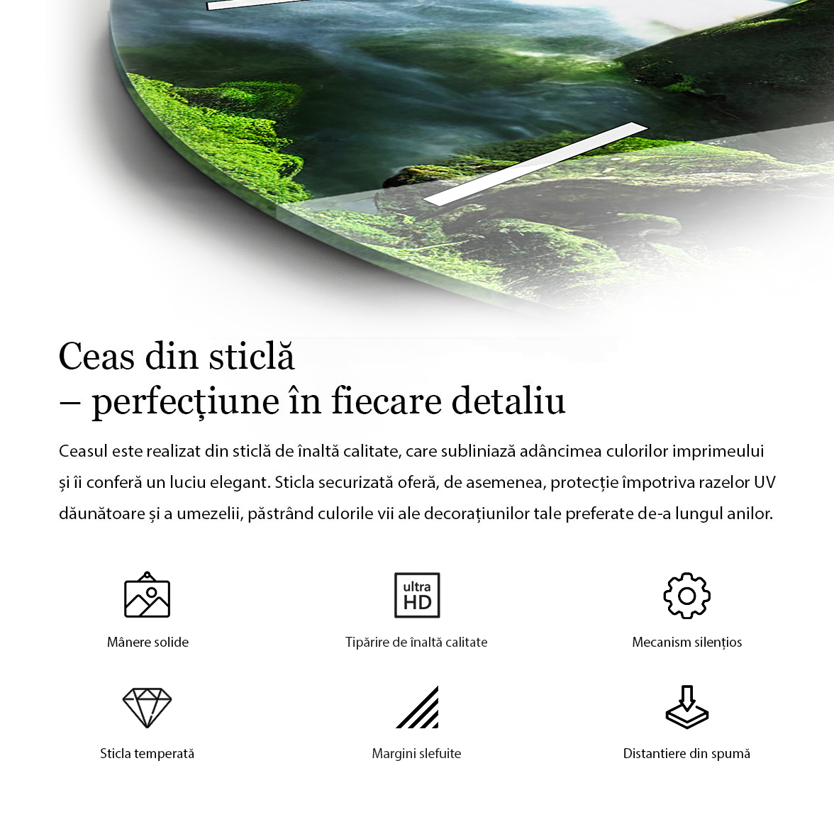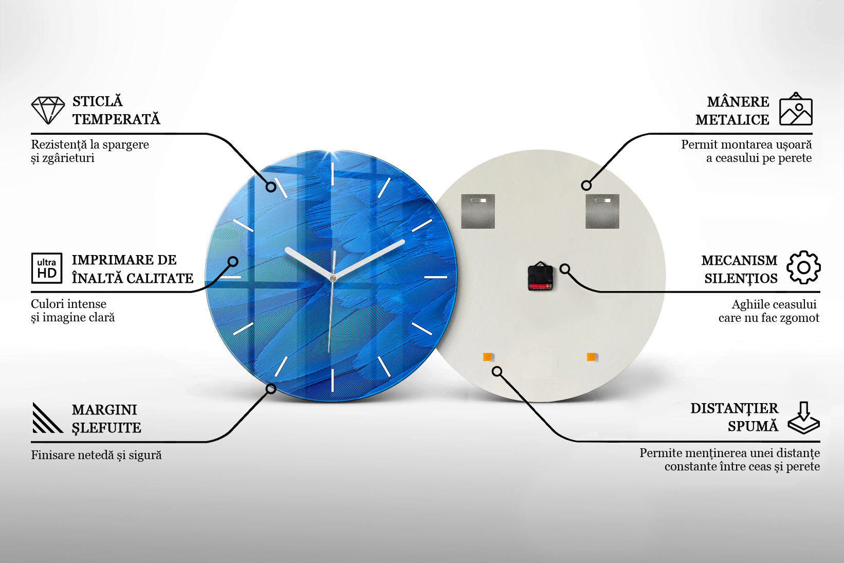 Rețineți că achiziționați un ceas de sticlă cu imprimeu. Modelele precum sclipici, aur, argint, beton, marmură, tablă ruginită etc. sunt imprimate, ceea ce poate duce la diferențe de aspect față de materialele originale.