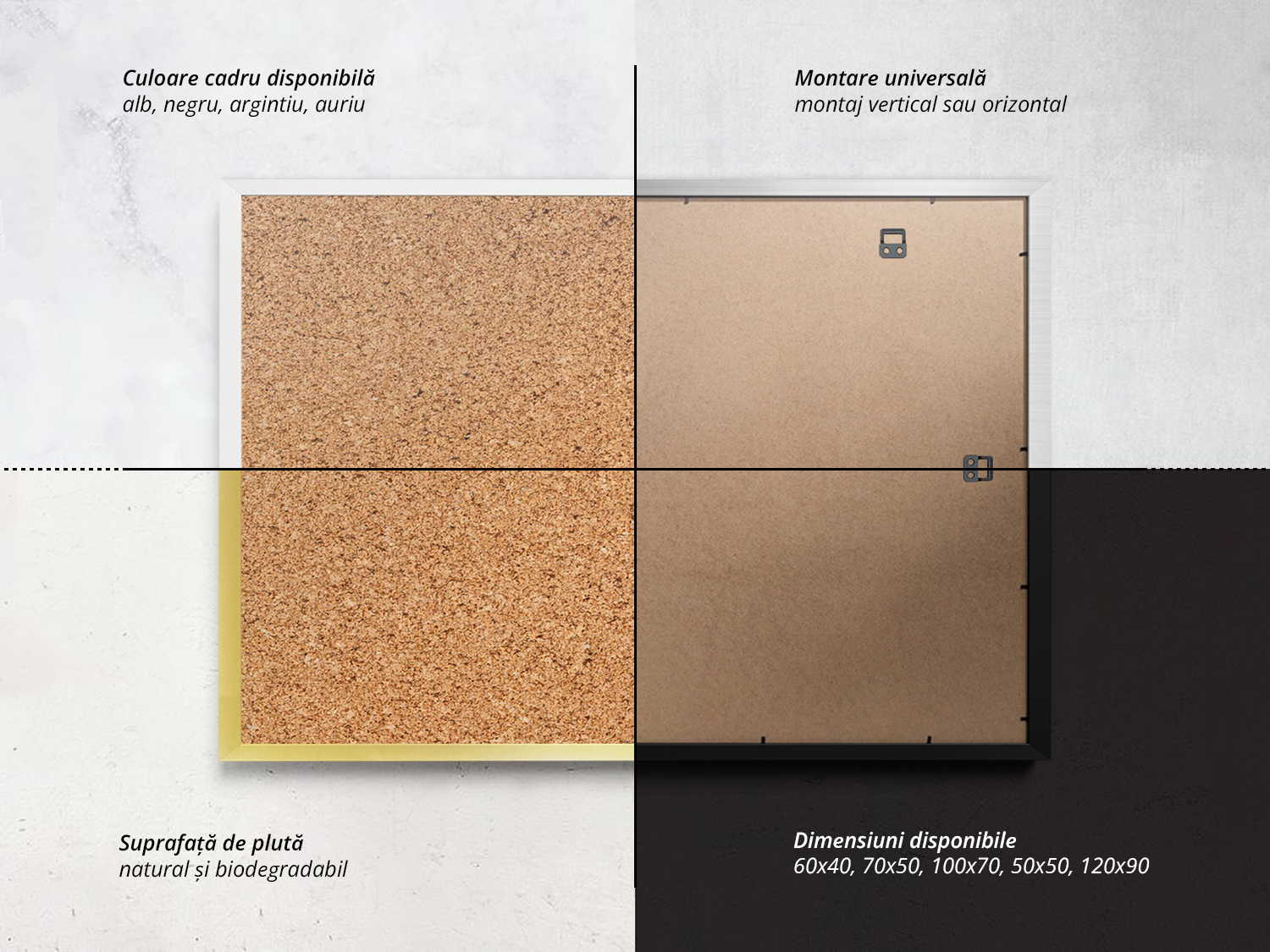Folosește-l pentru a afișa fotografii, mesaje motivaționale, liste de idei sau mementouri importante – panoul devine rapid un element decorativ central, care reflectă gusturile și stilul tău personal. Este mai mult decât un obiect funcțional: este un accent vizual care adaugă caracter și dinamism încăperii. Alege să îți personalizezi spațiul cu bun gust și rafinament – acest panou de plută este exact ceea ce lipsea pentru a completa perfect atmosfera dorită. Investește într-un accesoriu care nu doar organizează, ci inspiră!