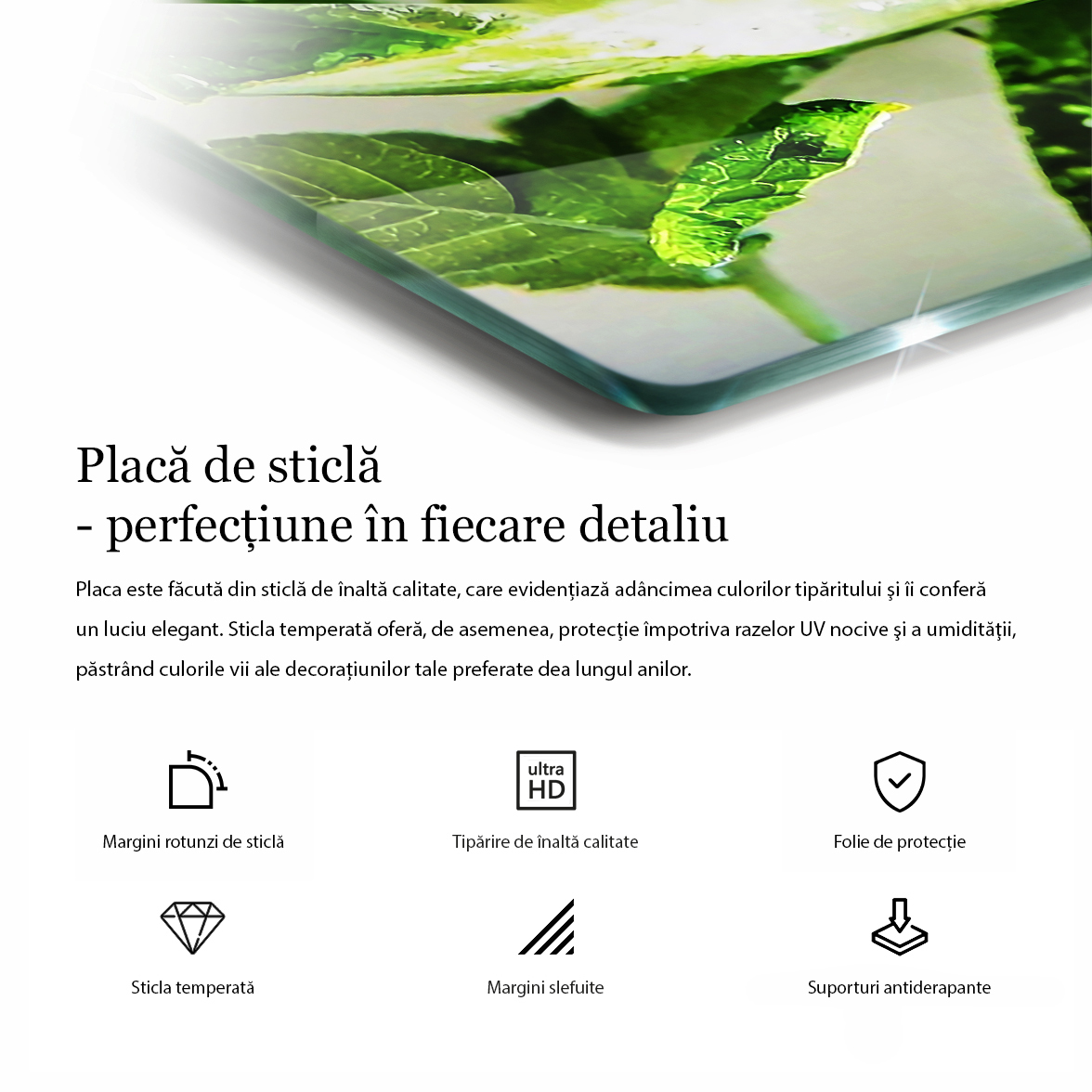 ♦ Rezistență la apă – Sticla este impermeabilă, protejând imprimeul de stropiri accidentale.